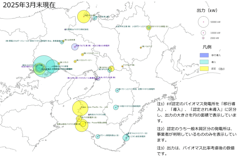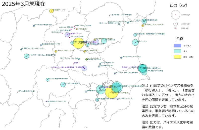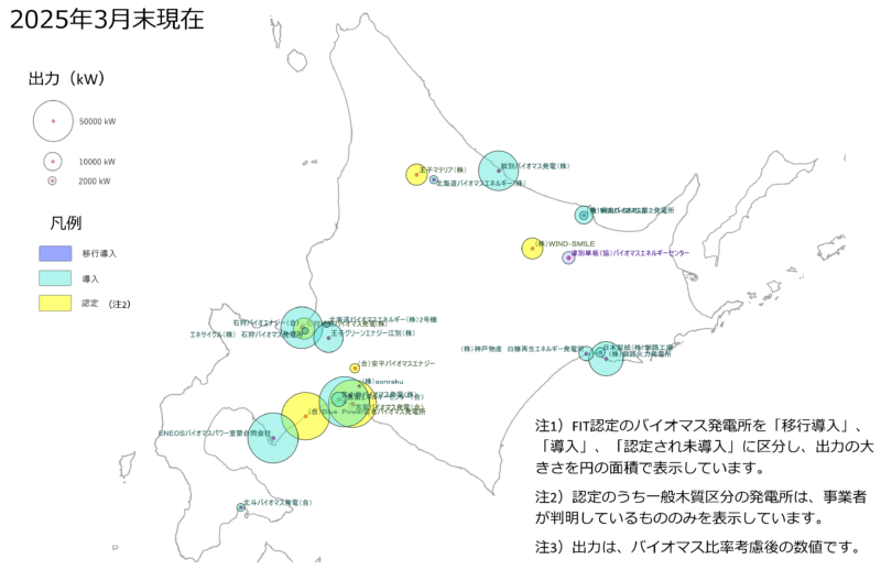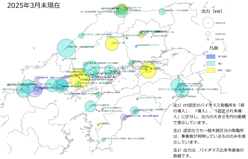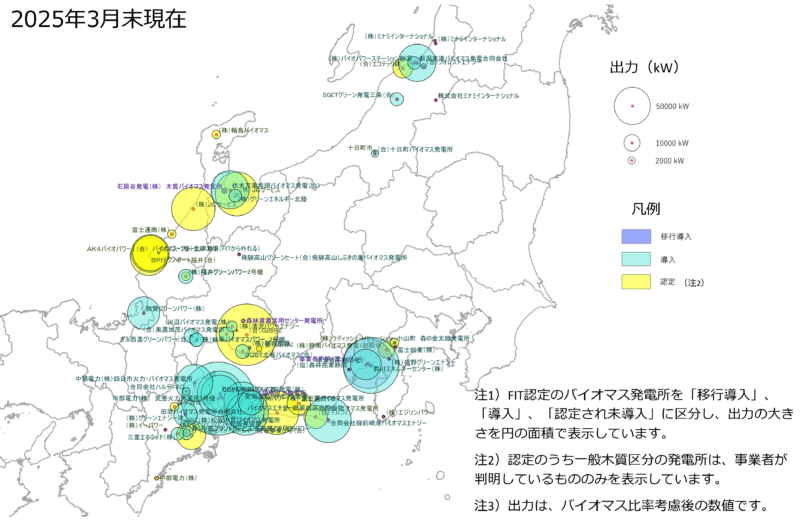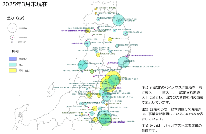 FIT認定木質バイオマス発電所一覧は、資源エネルギー庁から公表された「未利用木質」「一般木質および農作物残さ」「建築廃材」区分の木質バイオマス発電所を表示しています。