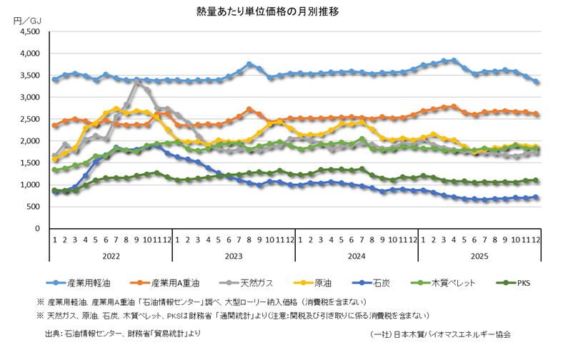 前述の燃料価格の推移と貿易統計の資料と合わせて木質系燃料と化石燃料の熱量あたりの平均価格比較も行っています。※天然ガス、原油、石炭、木質ペレット、PKSは財務省「通関統計」より。通関統計の数値には商社のマージン、輸入引き取り消費税を含まないのであくまでも参考数値として見てください。