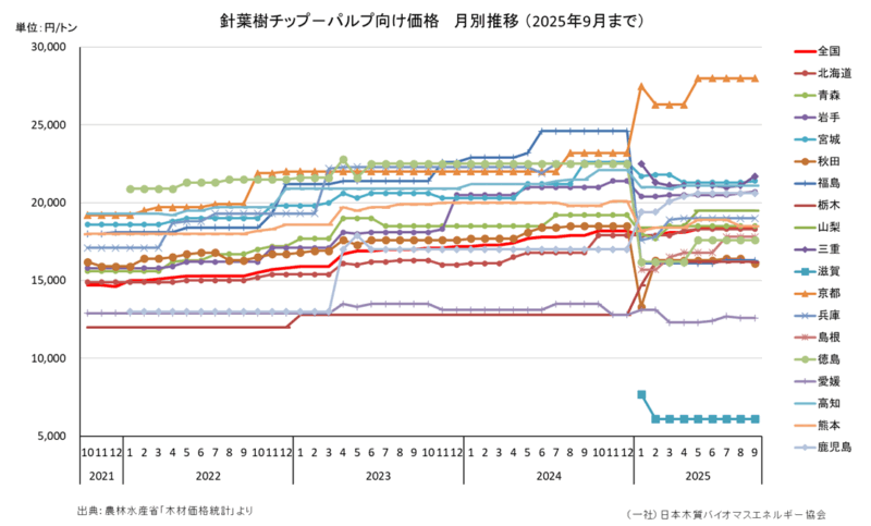 針葉樹チップ─パルプ向け価格を調査県別に、月別推移でグラフ化したものです。