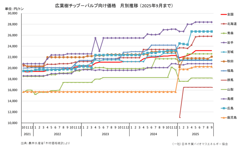 広葉樹チップ─パルプ向け価格を調査県別に、月別推移でグラフ化したものです。