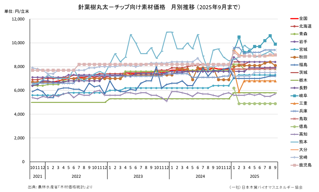 針葉樹丸太─チップ向け素材価格を調査県別に、月別推移でグラフ化したものです。