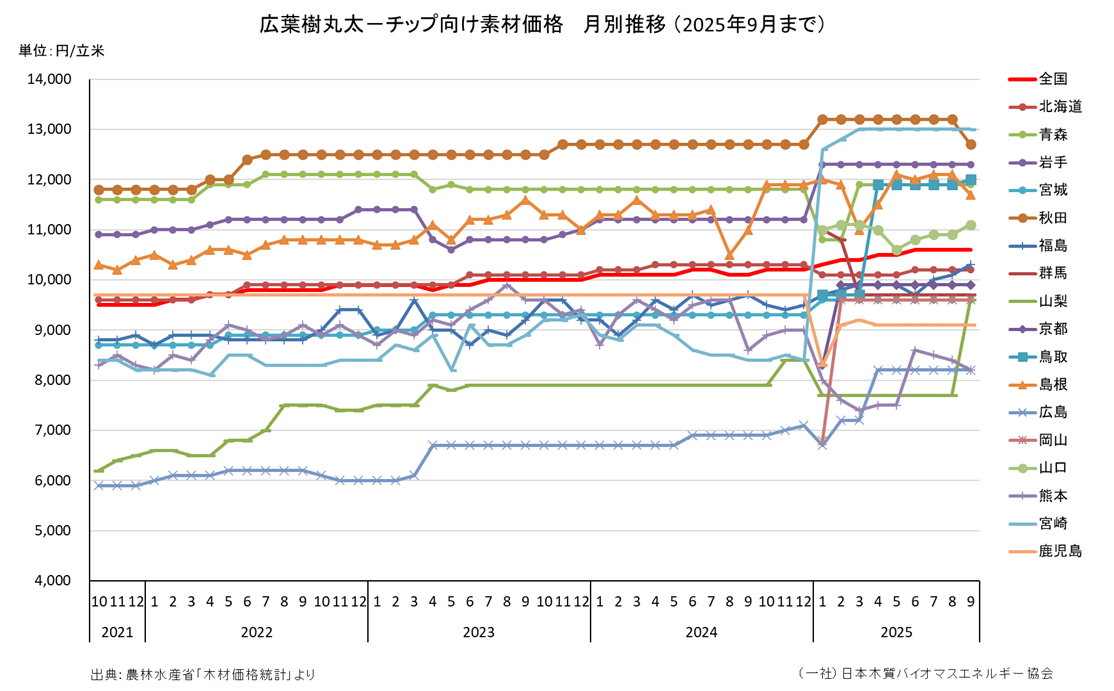 広葉樹丸太─チップ向け素材価格を調査県別に、月別推移でグラフ化したものです。